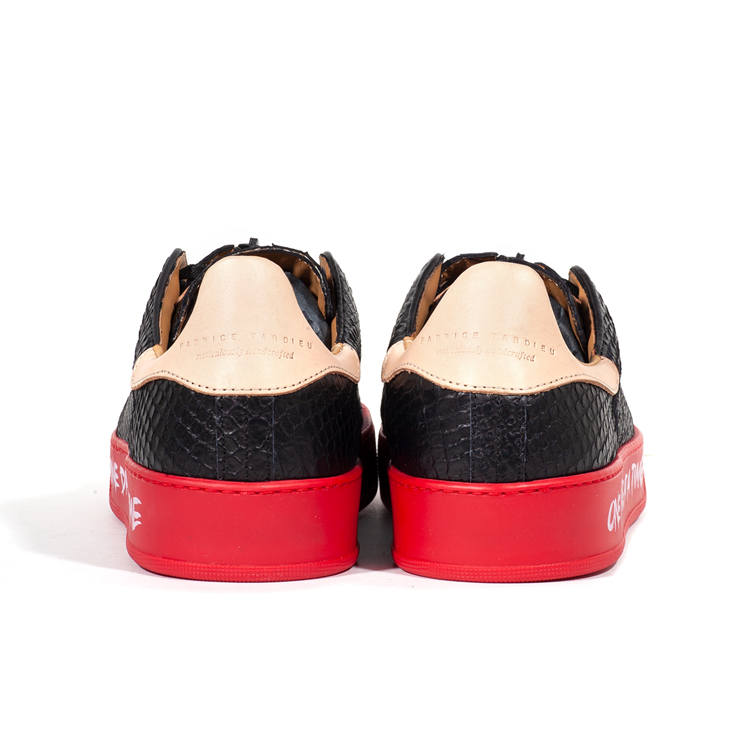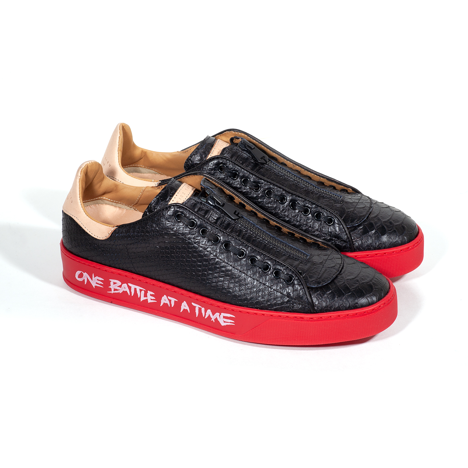 The Men’s Garry Obaat Black Red Python low-top sneaker is dramatically designed with a bold black Python hand-cut leather print giving it that luxurious snakeskin pattern. The vibrant red custom sole is hand-paint printed with Fabrice’s signature “ONE BATTLE AT A TIME” and “ONE DAY AT A TIME” on the outer soles and engraved logo on the inside of the soles. Stylishly finished with black waxed laces, black zipper detail on the tongue pebble and beige leather heel tab. Designed for more comfort, back support and a sophisticated aesthetic.