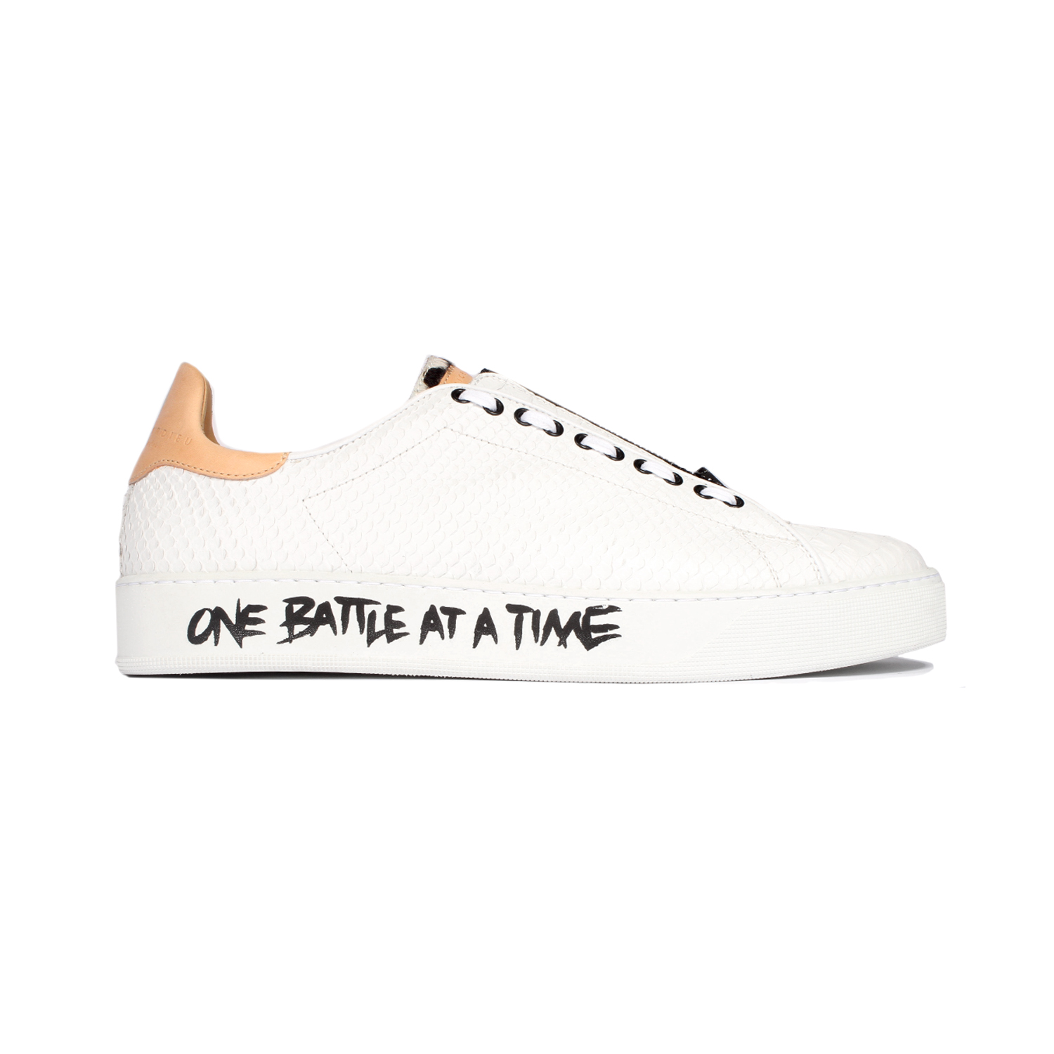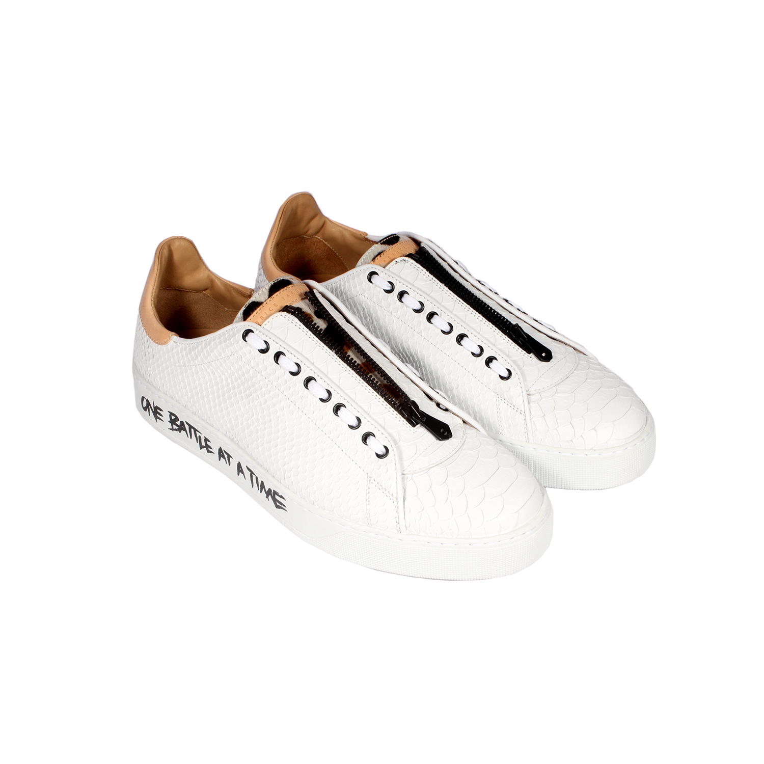 Fabrice Tardieu Exclusive (Online Only): The Men’s Garry dress sneaker is a slip-on style low-top sneaker with upscale appeal. This versatile sneaker is hand-cut in white leather Python print and embellished with camouflage print pony hair on the tongue pebble. The supple white rubber soles are handwritten in black acrylic leather paint (graffiti-style) that read Fabrice’s signature “ONE DAY AT A TIME” and “ONE BATTLE AT A TIME”. Stylishly finished with white waxed laces, black zipper detail and beige leather heel tab.