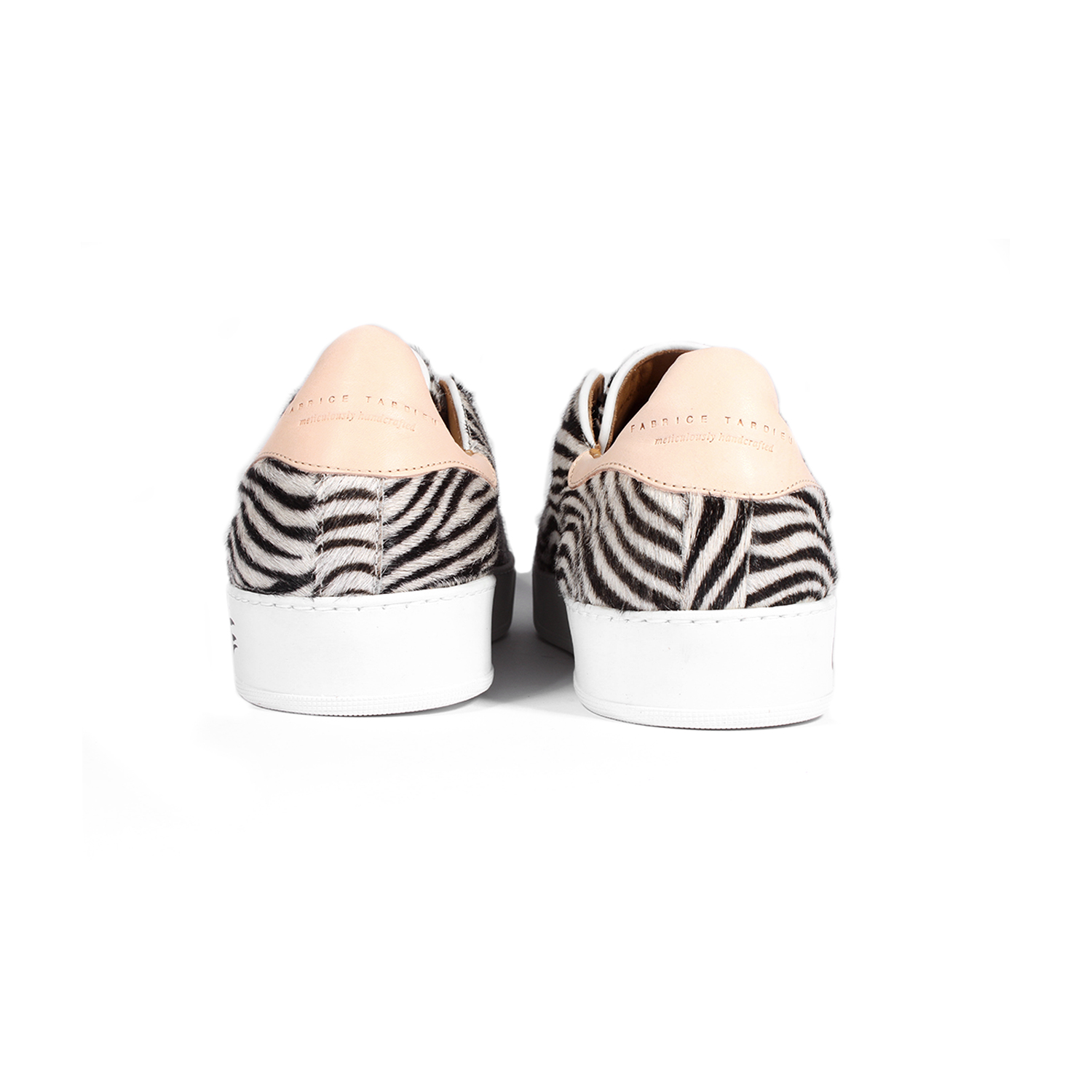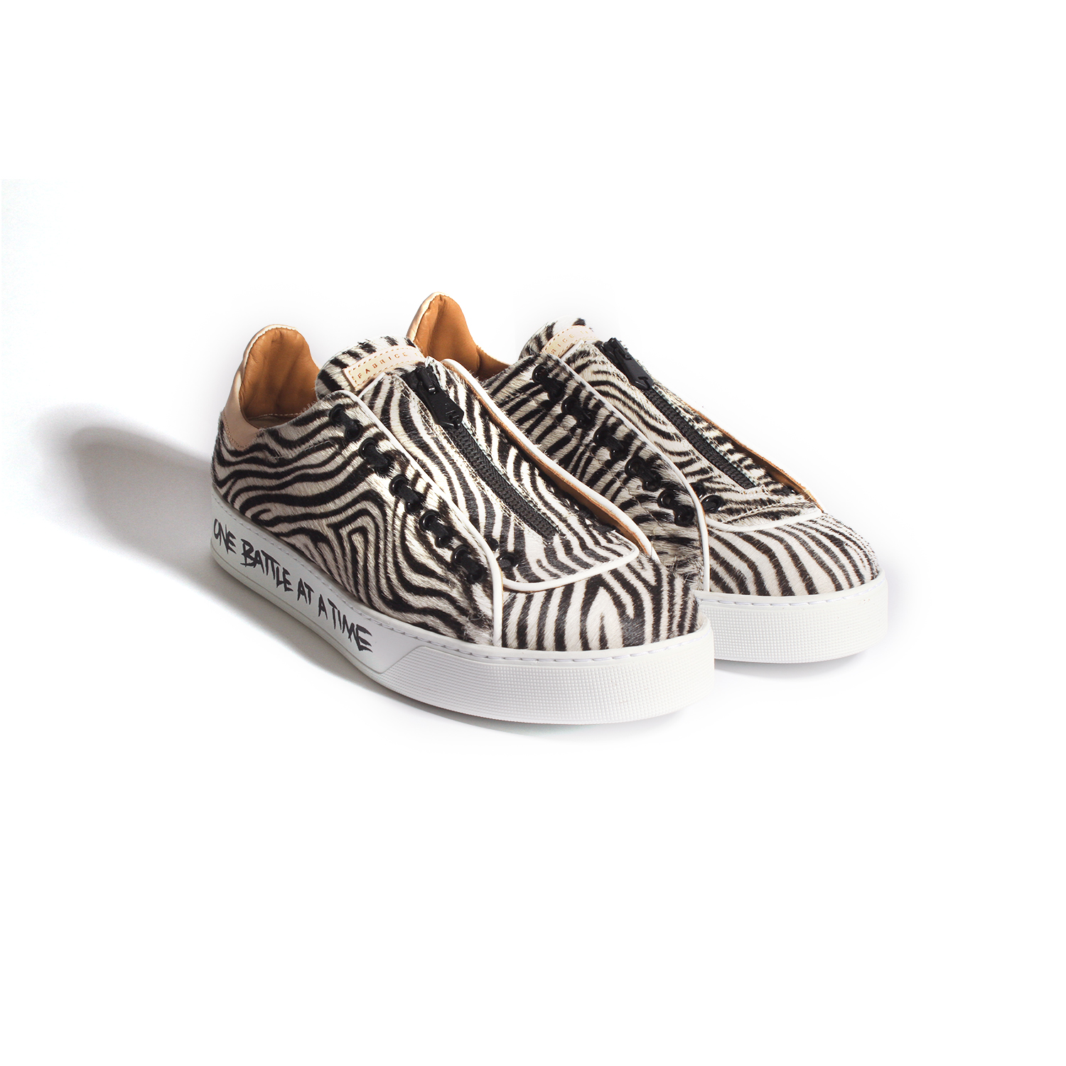 The Men’s Garry dress sneaker is a stylish slip-on sneaker embellished with zebra print pony hair. The supple white rubber soles are handwritten in black acrylic leather paint (graffiti-style) that read Fabrice’s signature “ONE DAY AT A TIME” and “ONE BATTLE AT A TIME”. Finished with black waxed laces, black zipper detail and beige leather heel tab.
