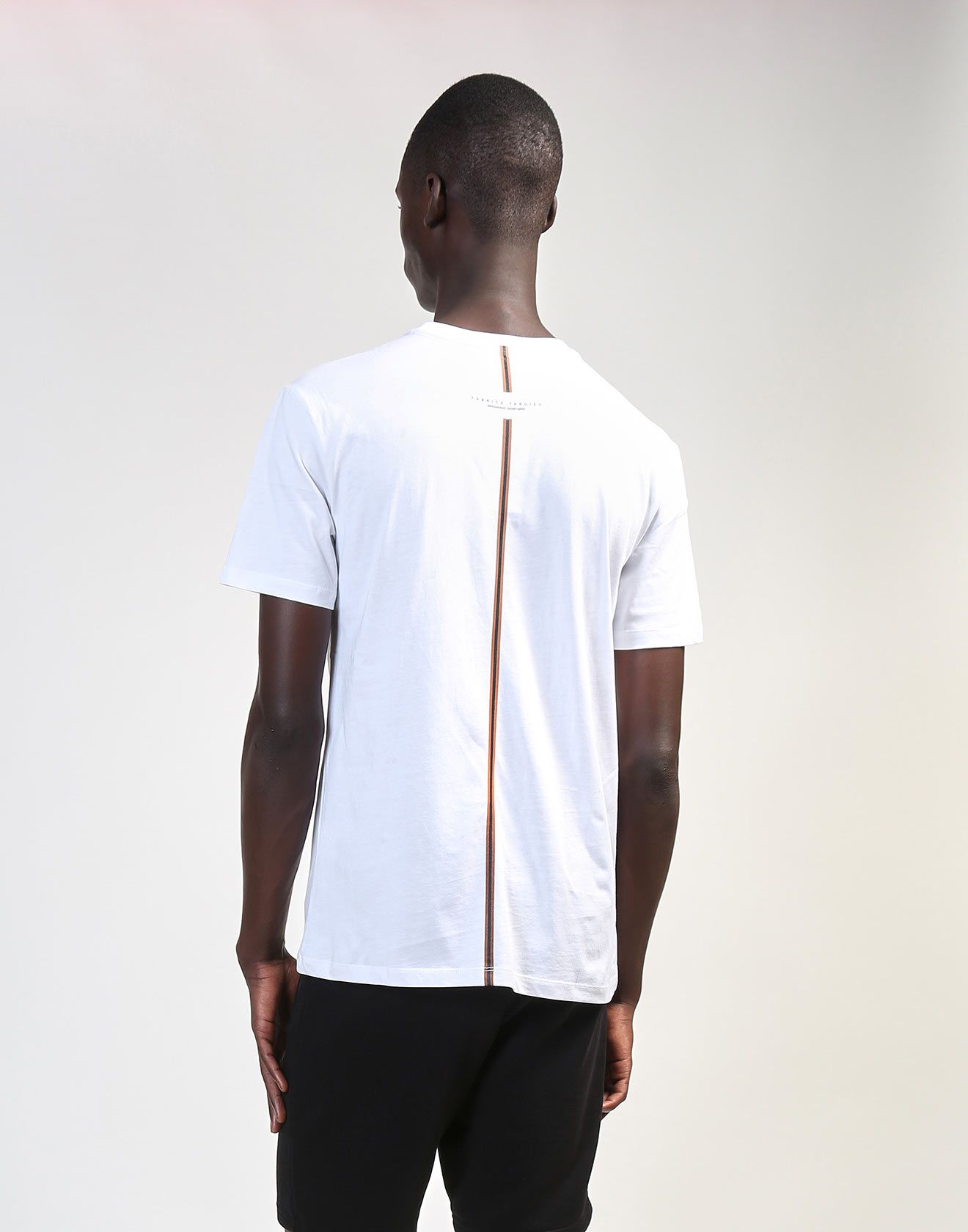 White short-sleeve v-neck with “Expensive” written on left shoulder. 100% Cotton. Fabrice Tardieu stripe centered on the back.